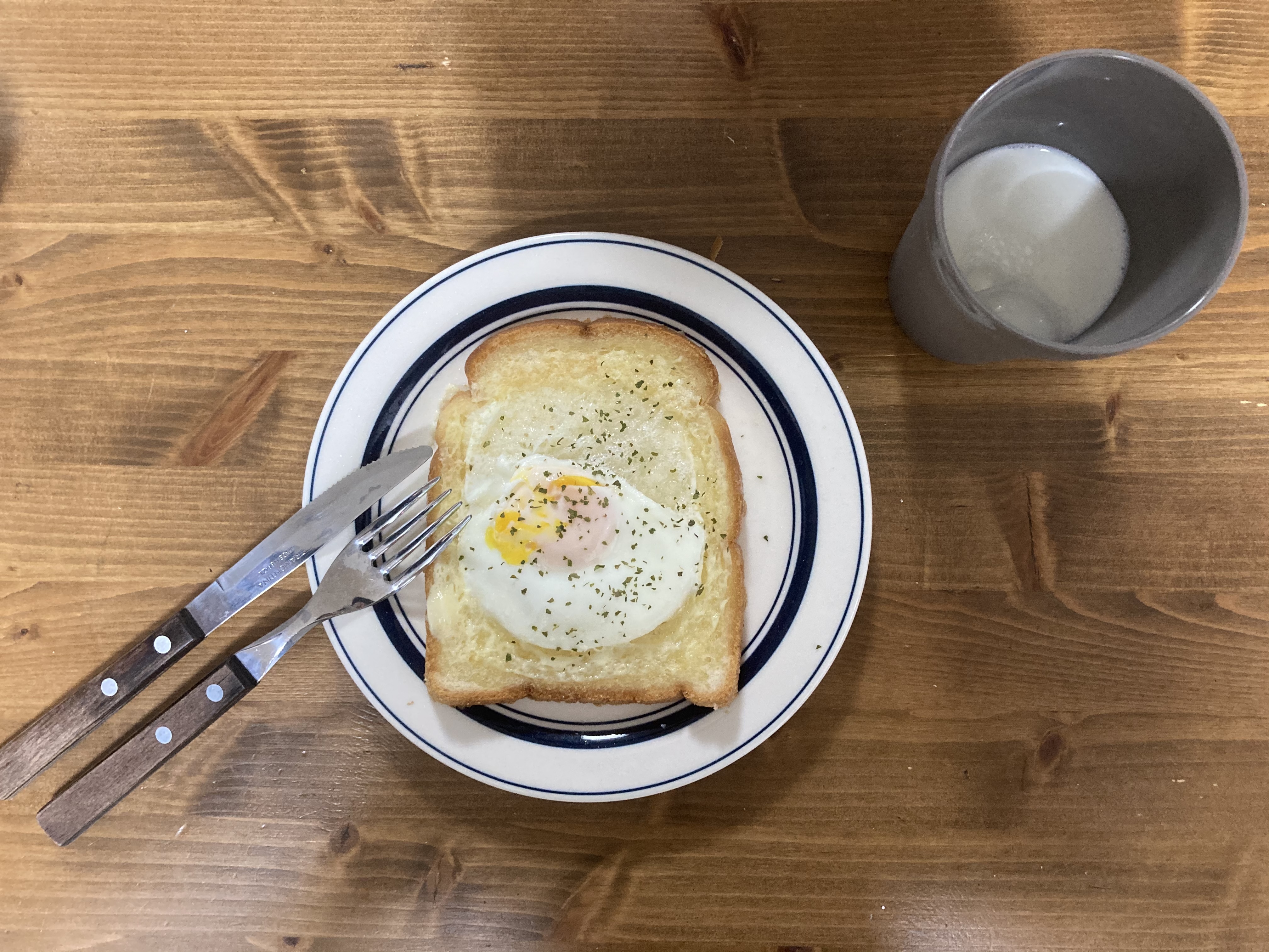 식빵 한가운데에 계란을 한개 깨뜨려 올려주고 포크로 노른자를 살짝 찔러줍니다.